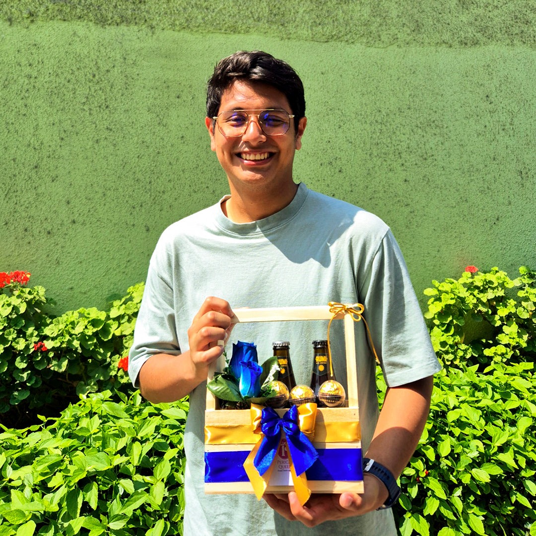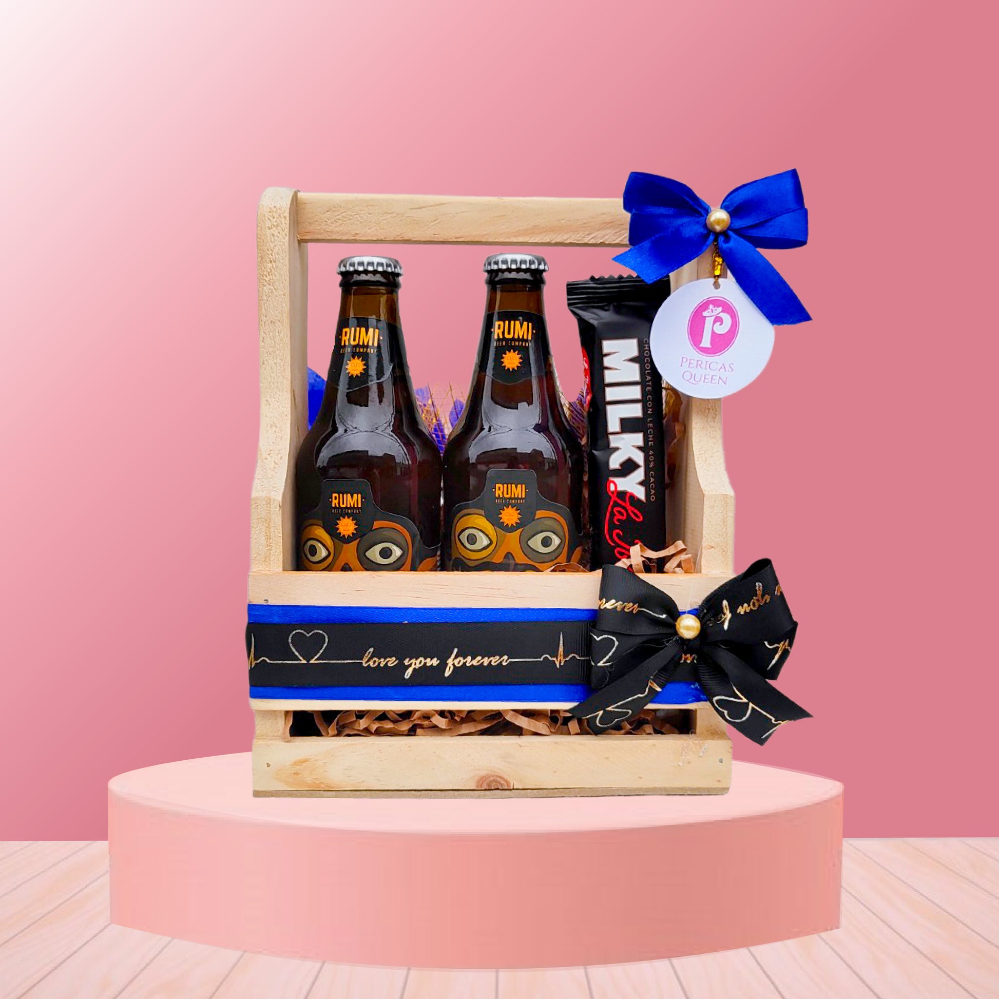 Canasta contiene dos bebidas de la marca Rumi y un chocolate de la marca Milky.