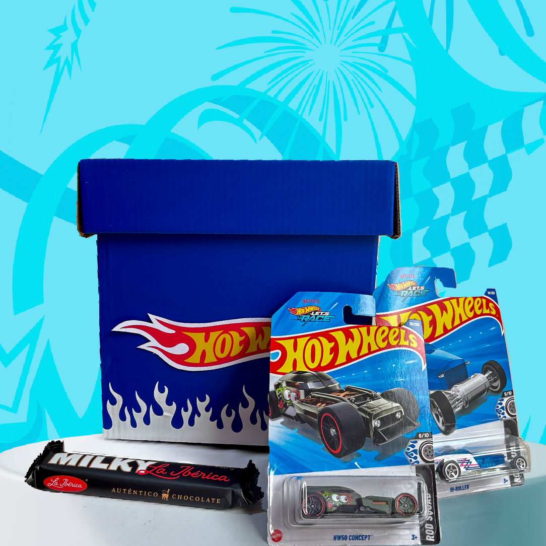 CAJA CON 2 HOTWEELS Y CHOCOLATE MILKY
