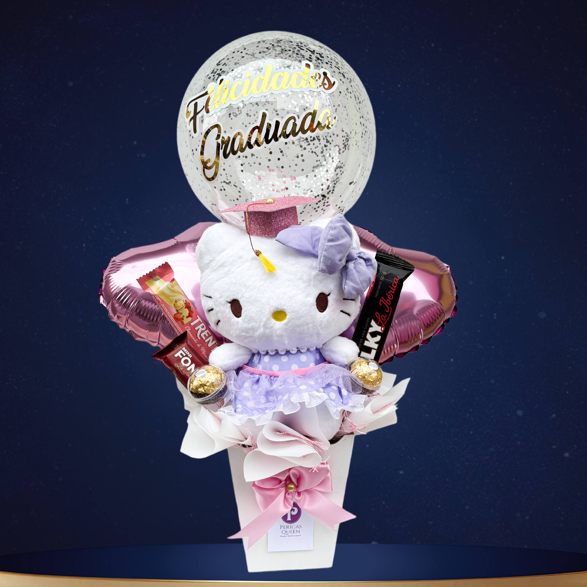 Un elegante arreglo en una caja blanca que tiene un peluche de Hello Kitty decorado con dos chocolates ferreiro y otros chocolates más para alegrar ese día tan especial.