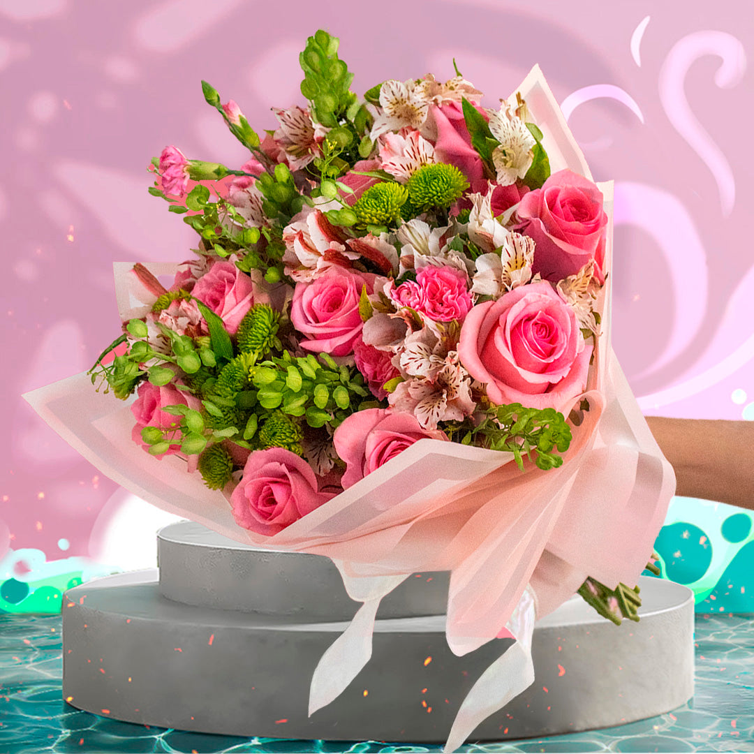 Ramo con 10 rosas y follaje, envueltos en papel coreano y lazo decorativo