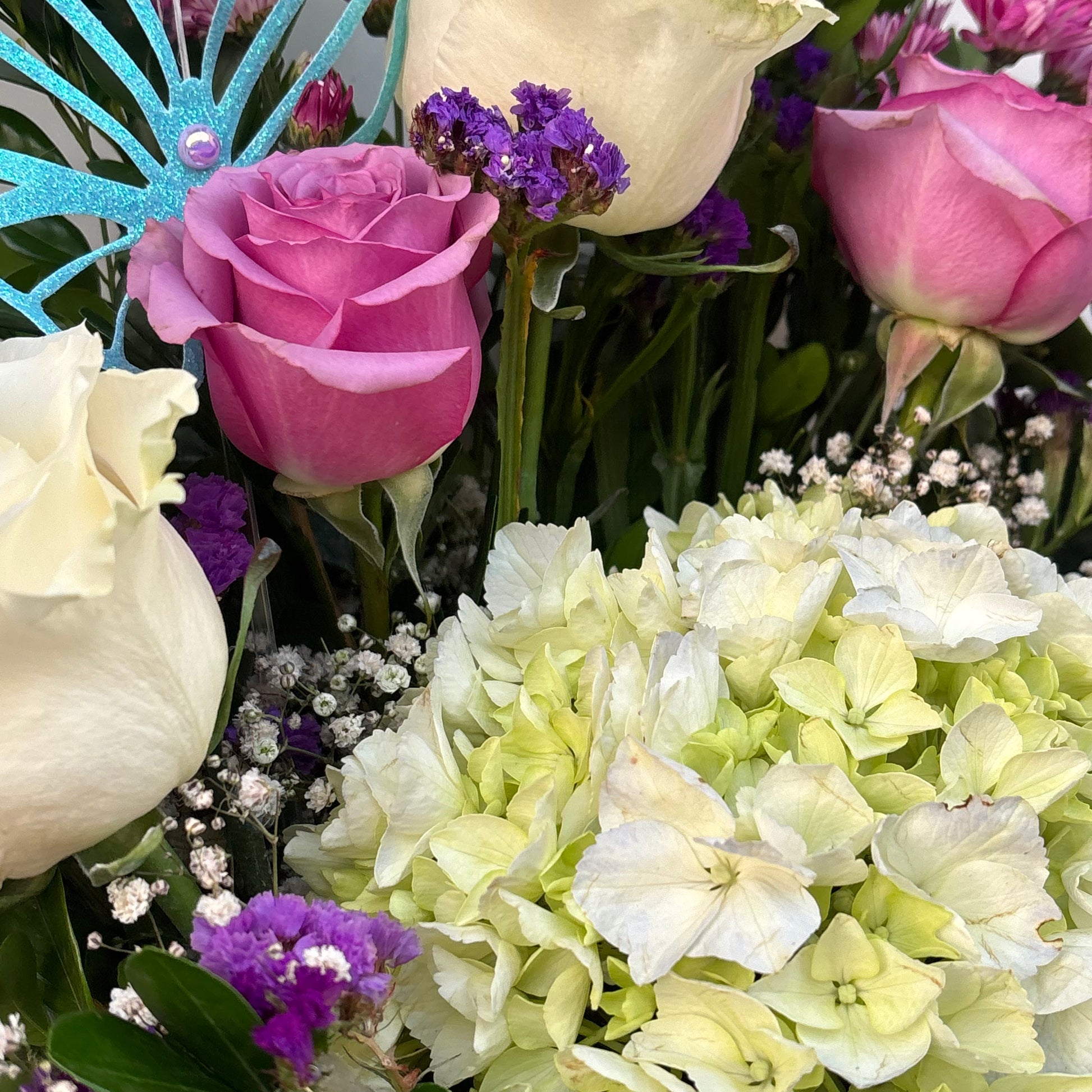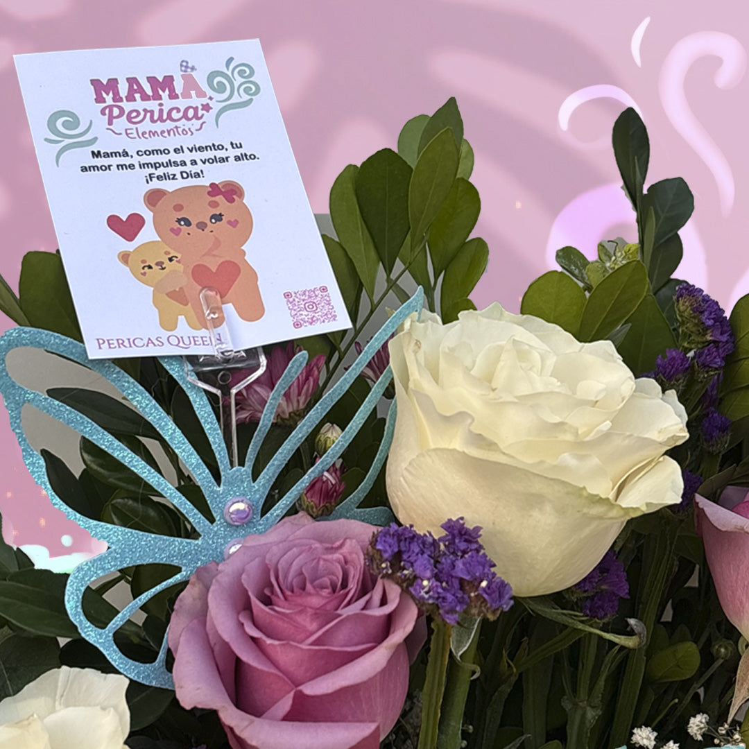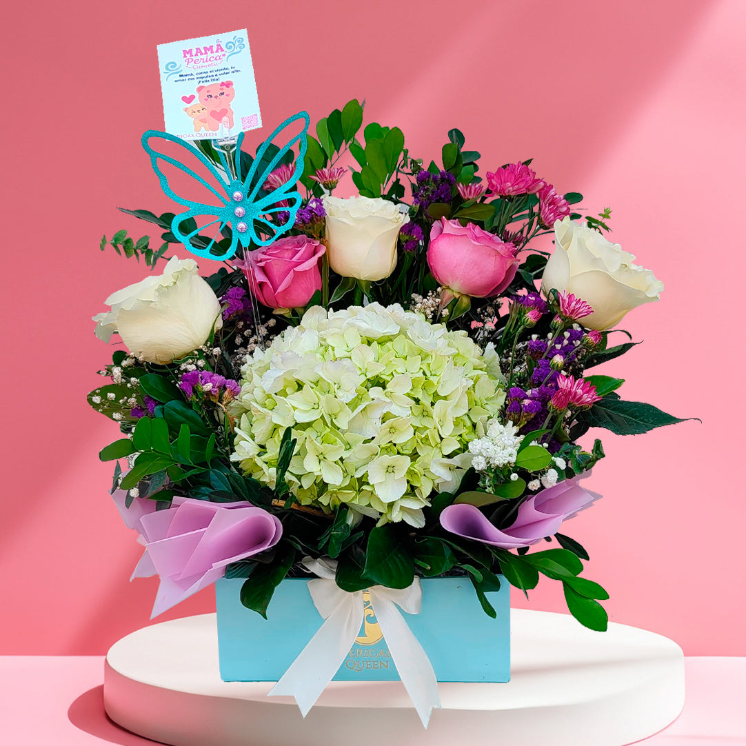 Flores en caja color celeste : rosas, claveles y follajes finos. Un arreglo sutil que representa la esencia suave y constante del amor maternal.