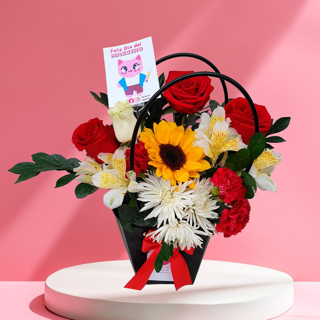 Este arreglo mezcla girasoles y flores blancas con acentos rojos en una base negra con asa. Ideal para una profe con energía positiva y corazón cálido.
