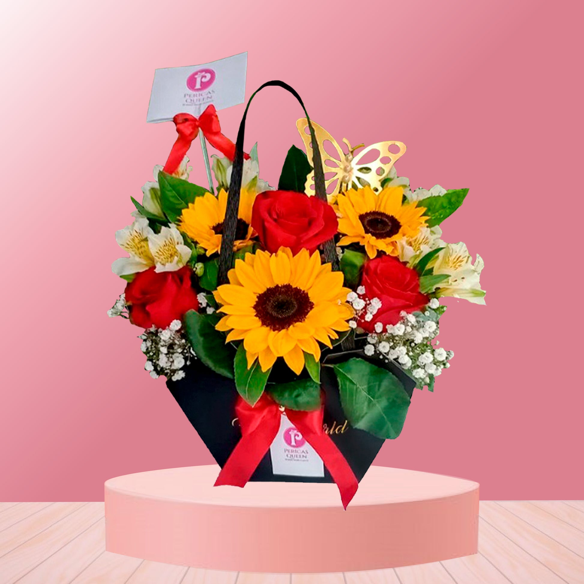 Está cartera contiene 3 girasoles, lluvia, 3 rosas rojas, astromelias y una tarjeta de dedicatoria, con su respectivo hang tag.