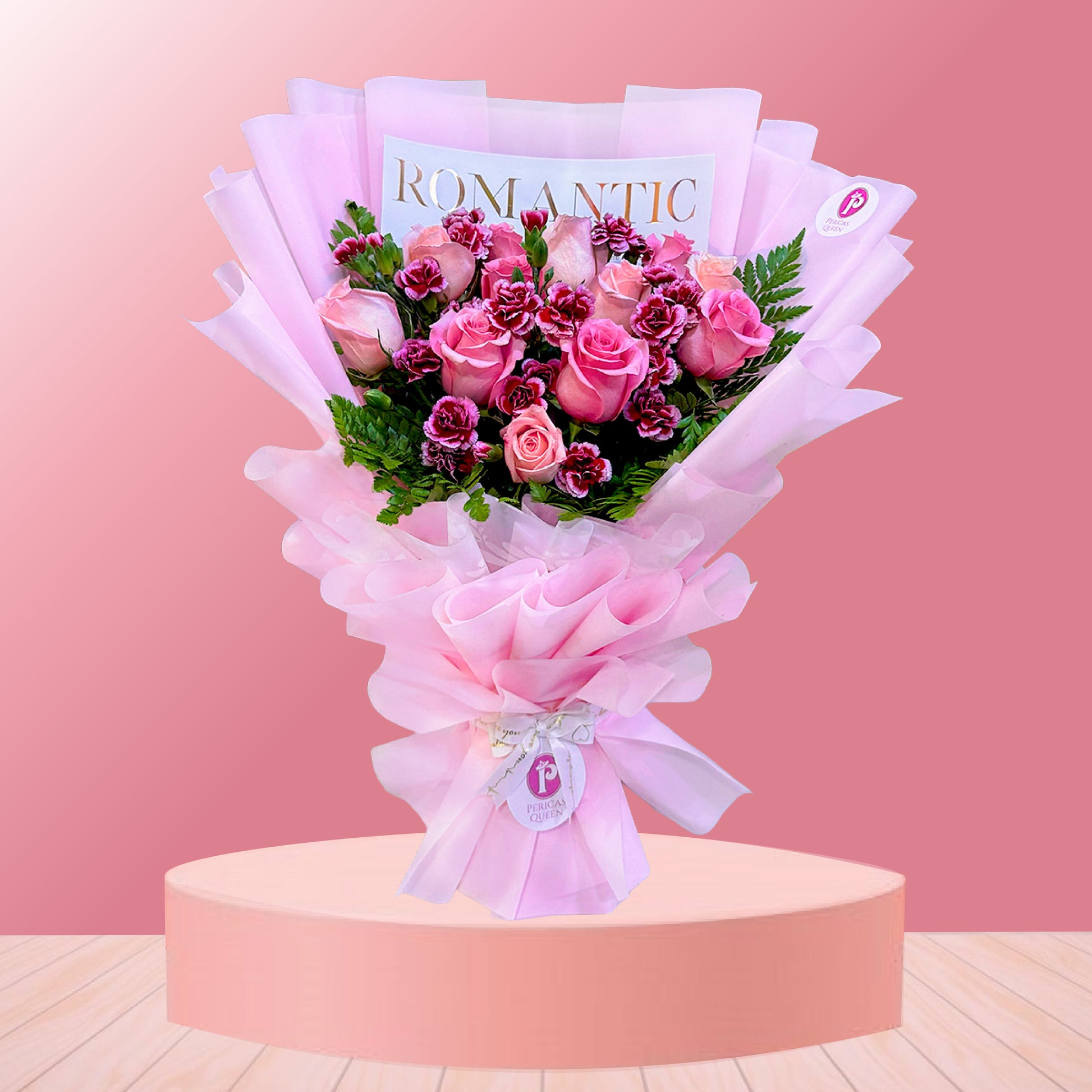 Este bello ramo contiene mirto, claveles morena , 6 rosas rosada color bebe y 6 fusión, papel rosado coreano, lazo blanco, hang Tag y tarjeta de dedicatoria.
