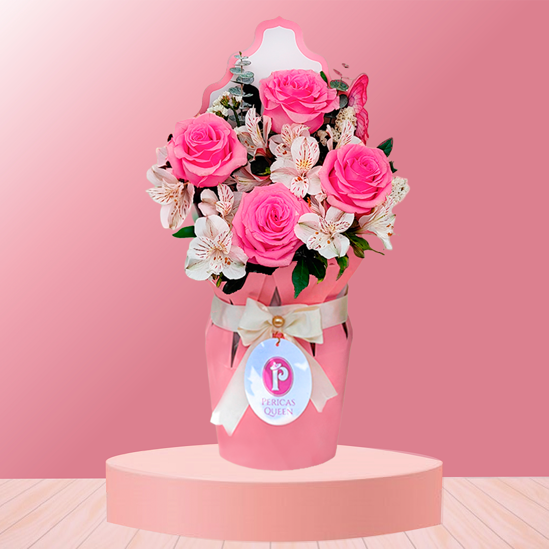 Este bello ramo contiene silver dollar, astromelias blanca , astetic blanco, 4 rosas rosadas, cartulina material folcote rosado, hang Tag y tarjeta de dedicatoria.